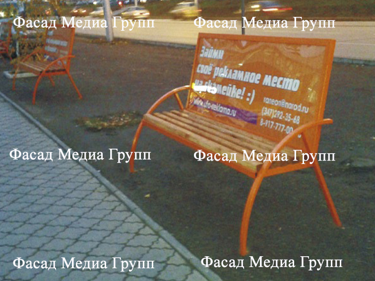 Уважаемые друзья! Для размещения рекламы на скамейках обращайтесь в рекламное агентство «Фасад Медиа Групп». Высокий уровень сервиса и низкие цены гарантируем. Мы все сделаем сами: дизайн и печать макета, монтаж и демонтаж. Фотоотчёт предоставляем бесплатно и в 100% объеме.